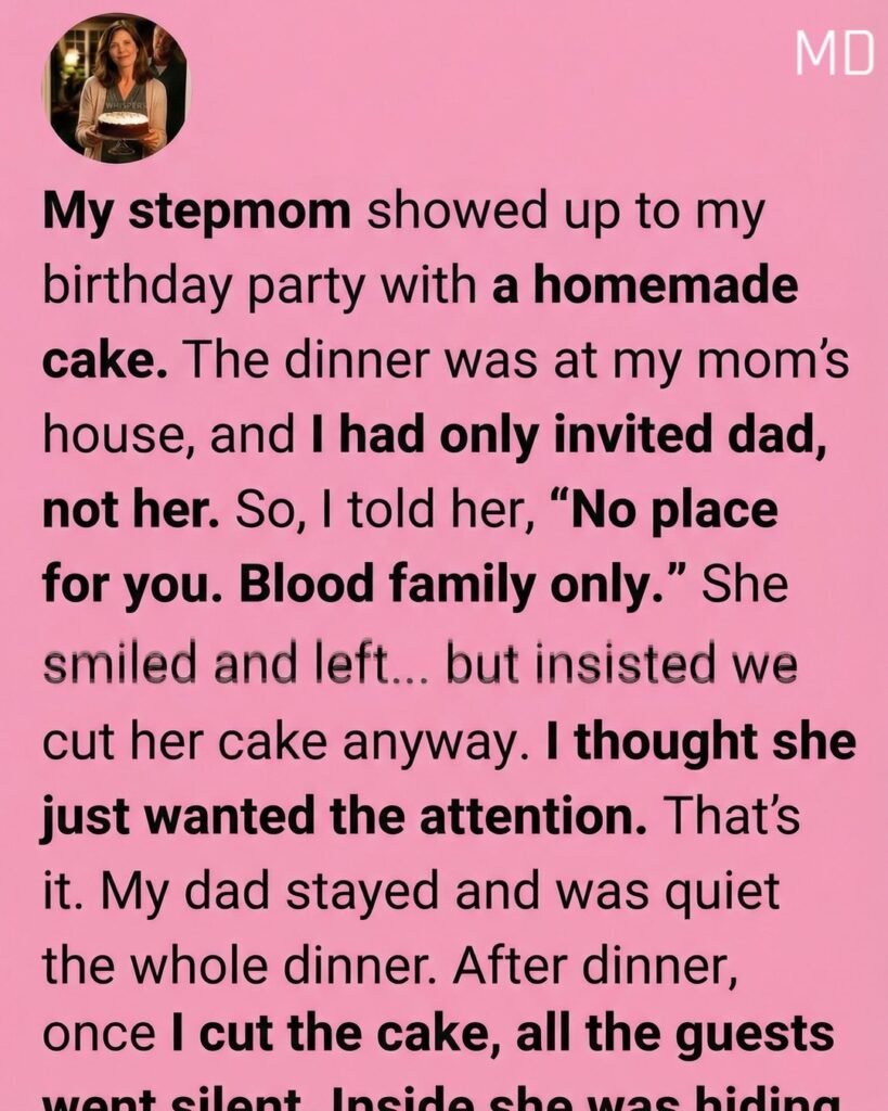 My stepmom showed up to my birthday party with a homemade cake. The dinner was at my mom’s house, and