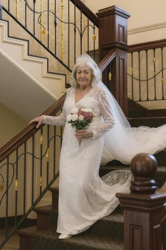 A moving photograph has gone viral across social media, capturing an elderly woman in a graceful white wedding gown, descending