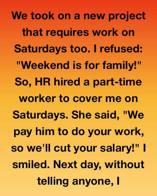 We took on a new project that requires work on Saturdays too. I refused: “Weekend is for family!” So, HR