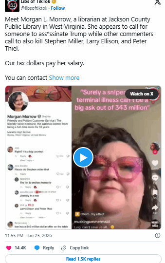 The woman identified by law enforcement is Morgan L. Morrow, 39, an employee of the Jackson County Public Library. According to the Jackson County Sheriff’s Department, Morrow was arrested on January 25, 2026, and charged with one count of making a terroristic threat. Investigators say the charge stems from a video posted on Instagram and TikTok that included language authorities interpreted as encouraging violence against former President Donald J. Trump.